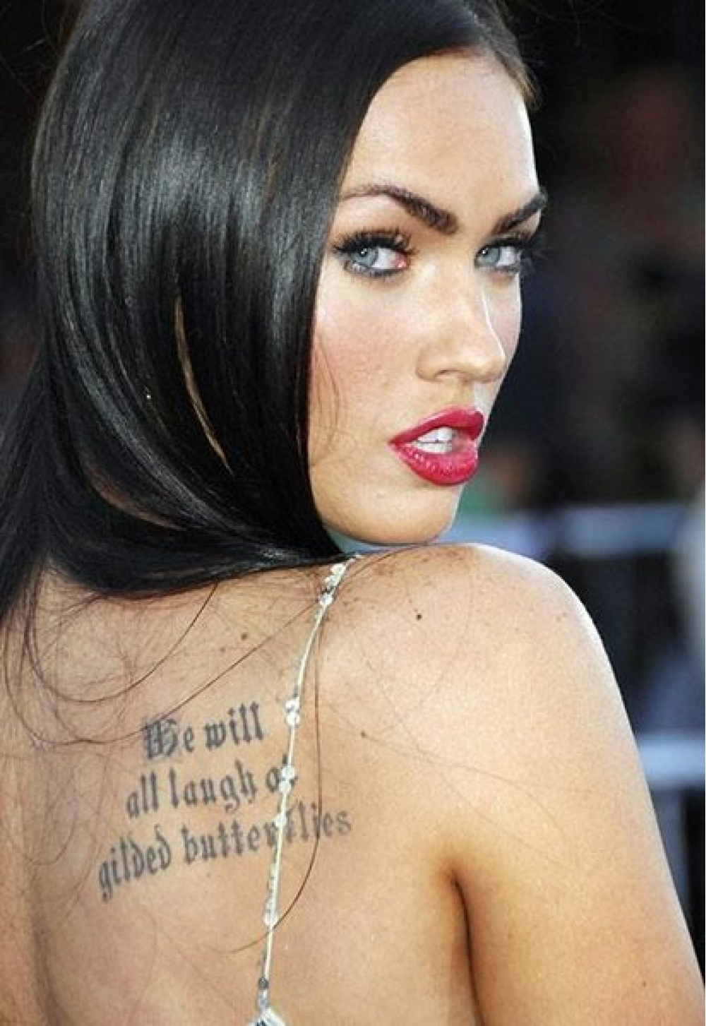Aktrisanın kürəyində "Hamımız ulduzlu kəpənəklərə güləcəyik" sözləri yazılıb. Qeyd edək ki,bu, yazıçı Villiam Şekspirin "Kral Lirin faciəsi" əsərindən bir cümlədir. Aktrisaya görə Hollivud filmlərinin ulduzu olsa belə, hələ çox şey öyrənməlidir.