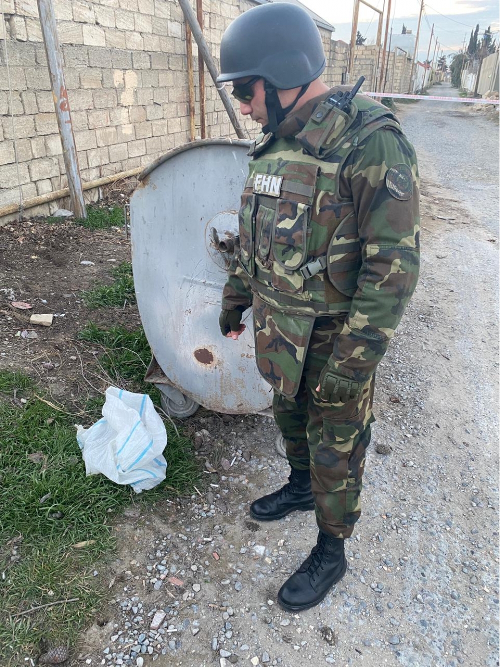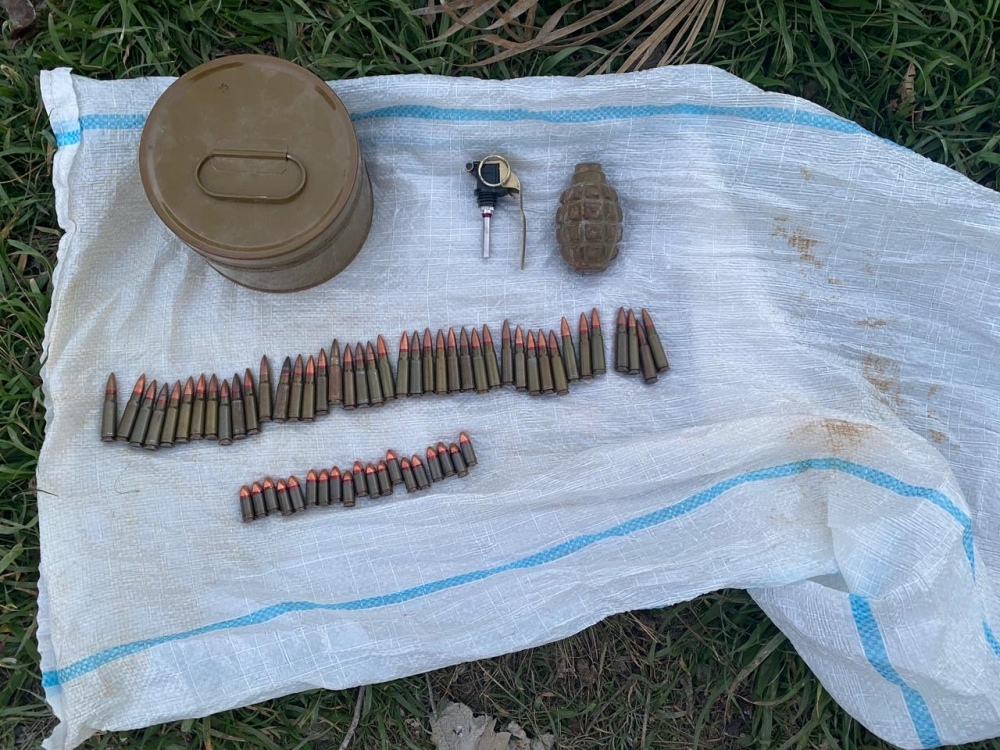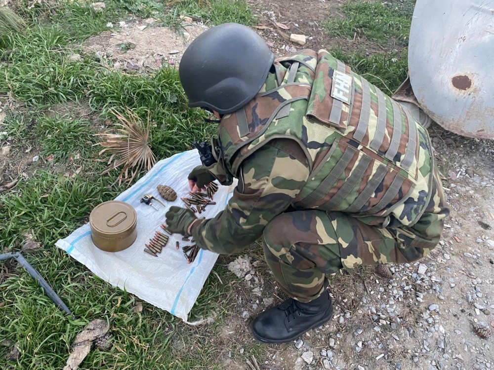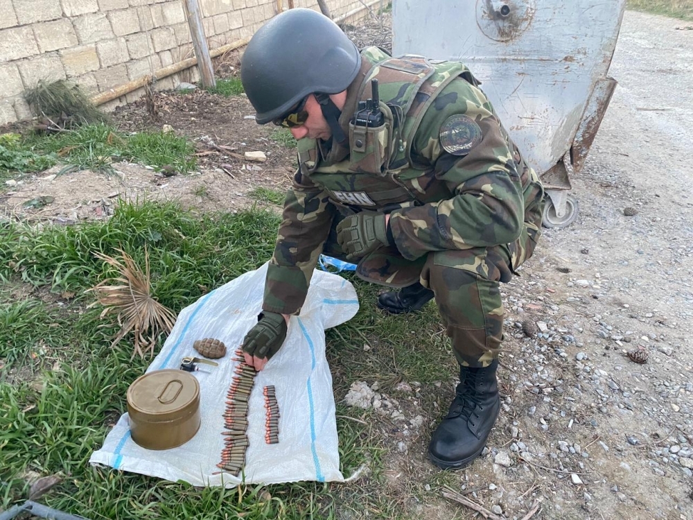 Sonra çevik qrupun mütəxəssisləri tərəfindən hadisə yerinə baxış zamanı aşkar edilmiş sursatların döyüş tətbiqinə yararlı 1 ədəd F-1 əl qumbarası, 1 ədəd M-75 qumbarasının partladıcısı, 1 ədəd DM-11 tüstü minası və 60 ədəd müxtəlif çaplı patron olduğu müəyyən edilib.