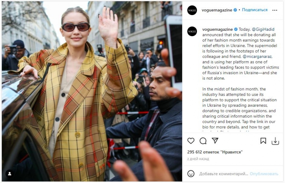 Bundan sonra "Vogue" sözügedən paylaşımda redaktə etmək məcburiyyətində qalıb. Onlar paylaşımda modelin yalnız Ukrayna ilə əlaqəli hissəsini saxlayıblar. Lakin rəsmi saytlarında yer alan xəbərdə hər hansı dəyişiklik etməyiblər.