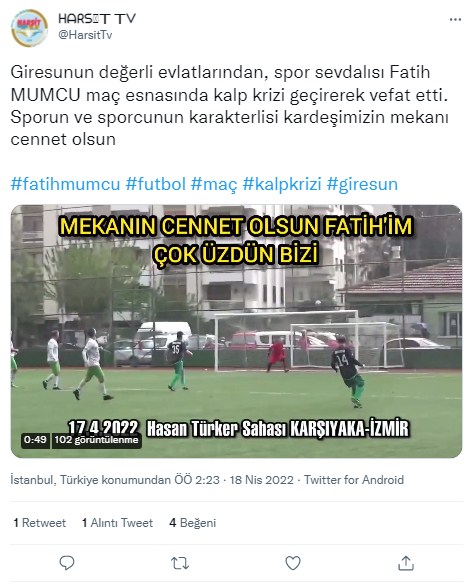 Türkiyəli veteran qapıçı Fatih Mumcu oyun vaxtı keçirdiyi infarktdan dünyasını dəyişib.
