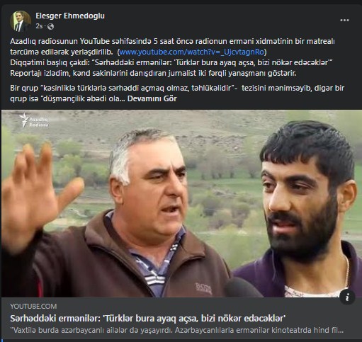 Ələsgər Əhmədoğlu paylaşımında sözügedən media qurumunun hazırladığı “Sərhəddəki ermənilər: “Türklər bura ayaq açsa, bizi nökər edəcəklər” başlıqlı materiala diqqət çəkib.