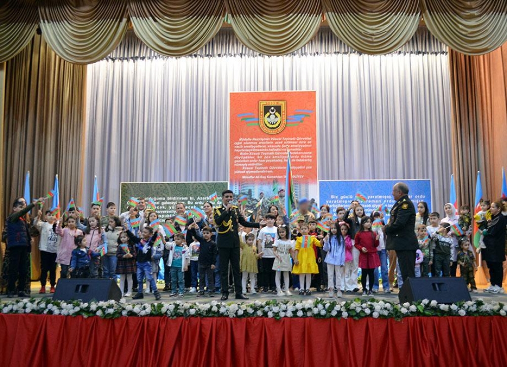 Xalq artistləri Mübariz Tağıyev, Gülyaz Məmmədova, Əməkdar artistlər Nuriyyə Hüseynova, Səmayə Sadıxova və Həzi Aslanov adına Ordu İdeoloji və Mədəniyyət Mərkəzinin solistlərinin ifasında səslənən vətənpərvərlik nəğmələri və ssenari müəllifinin qalib Vətən əsgərinə, möhtəşəm Zəfərə həsr etdiyi şeirlər şəhidlərin xatirəsinə ehtiram əlaməti olmaqla yanaşı, həm də salonda qələbə ovqatı yaradıb.