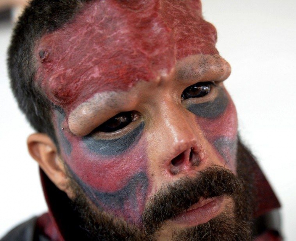 Sən demə bu qeyri-adi görünüşə malik olan  Henri Damon özünü  Amerikanın düşməni, olan Red Skull adlı caniyə  bənzətmək üçün  bir neçə əməliyyatlar keçirib.