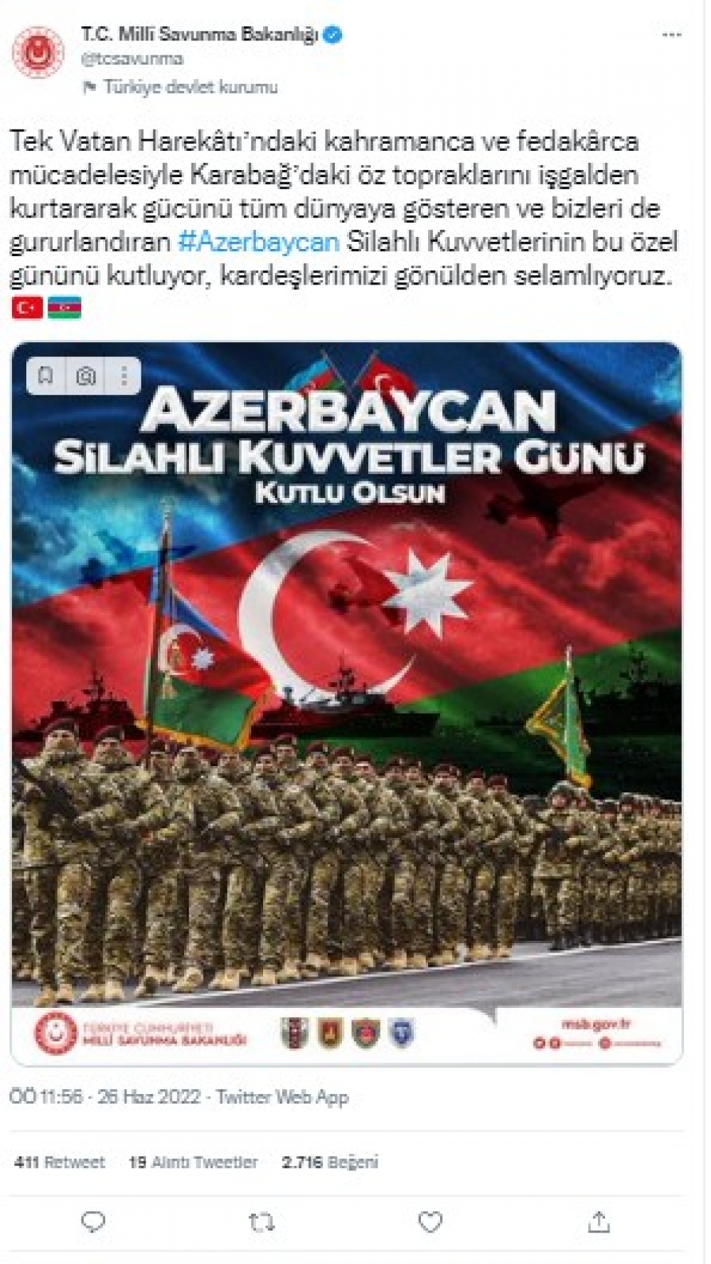 Türkiyə Milli Müdafiə Nazirliyi 26 iyun Silahlı Qüvvələr Günü münasibətilə Azərbaycan xalqını təbrik edib.