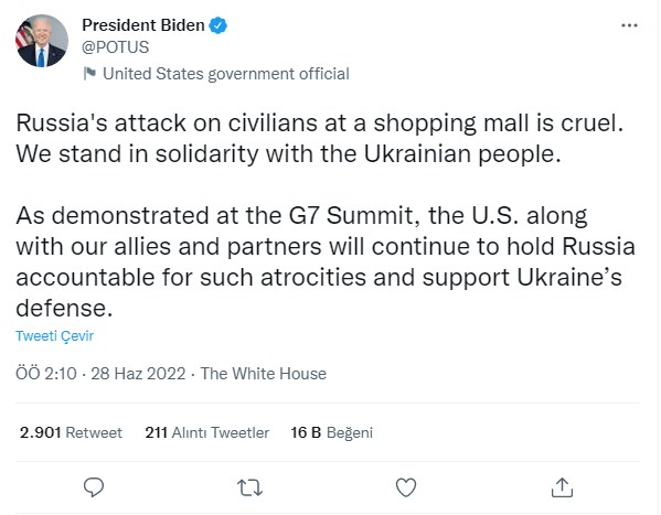 "Rusiyanın ticarət mərkəzində mülki şəxslərə zərbə endirməsi qəddardır. Biz Ukrayna xalqı ilə həmrəyik", - Bayden sosial şəbəkə hesabında yazıb.