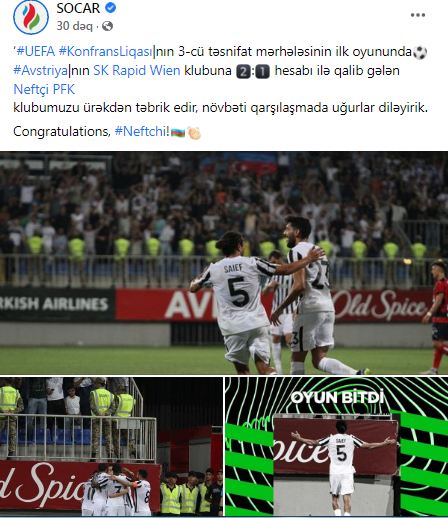SOCAR sosial şəbəkə səhifələrində UEFA Konfrans Liqasının 3-cü təsnifat mərhələsinin ilk oyununda Avstriyanın SK "Rapid Wien" klubuna 2:1 hesabı ilə qalib gələn "Neftçi" PFK klubuni təbrik edib.