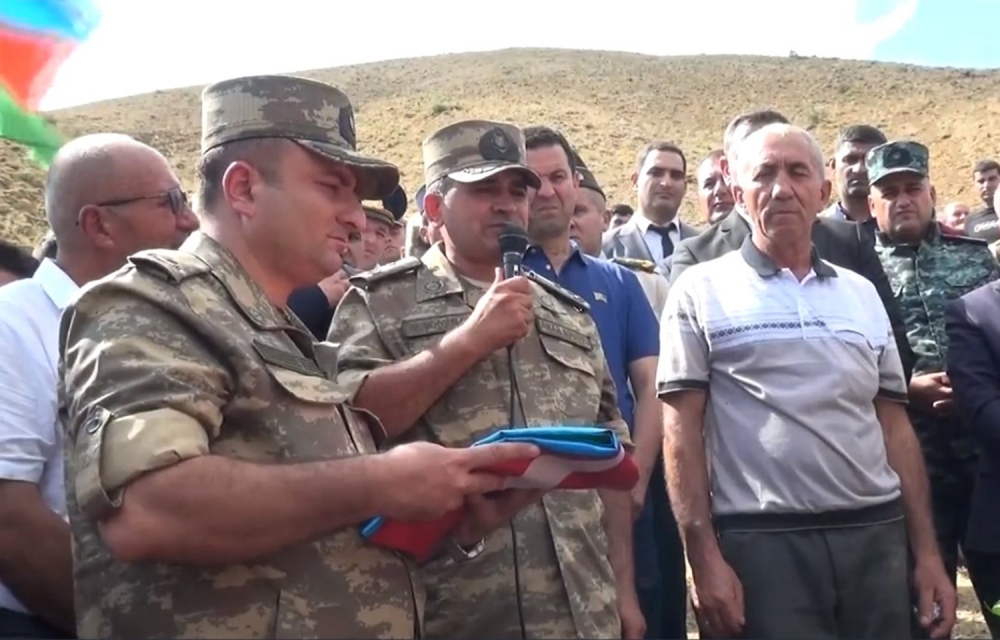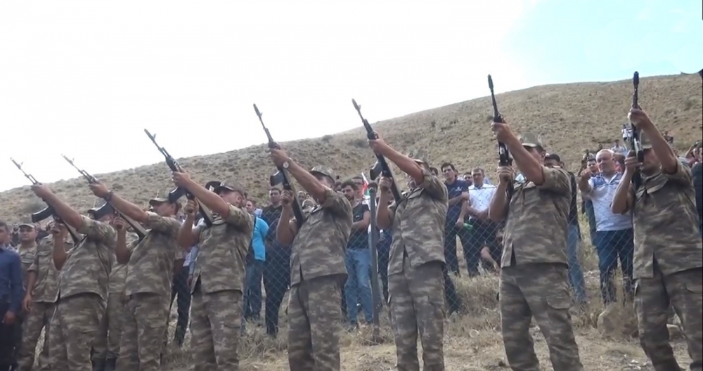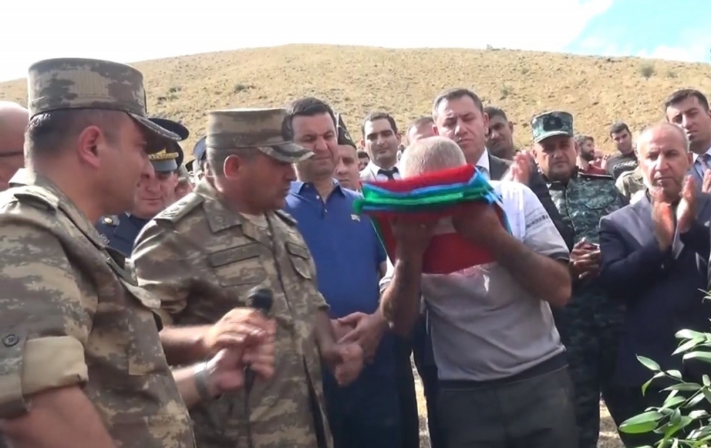Sonra üçrəngli Azərbaycan bayrağı şəhidimizin atasına təqdim edilib, yaylım atəşi açılıb.