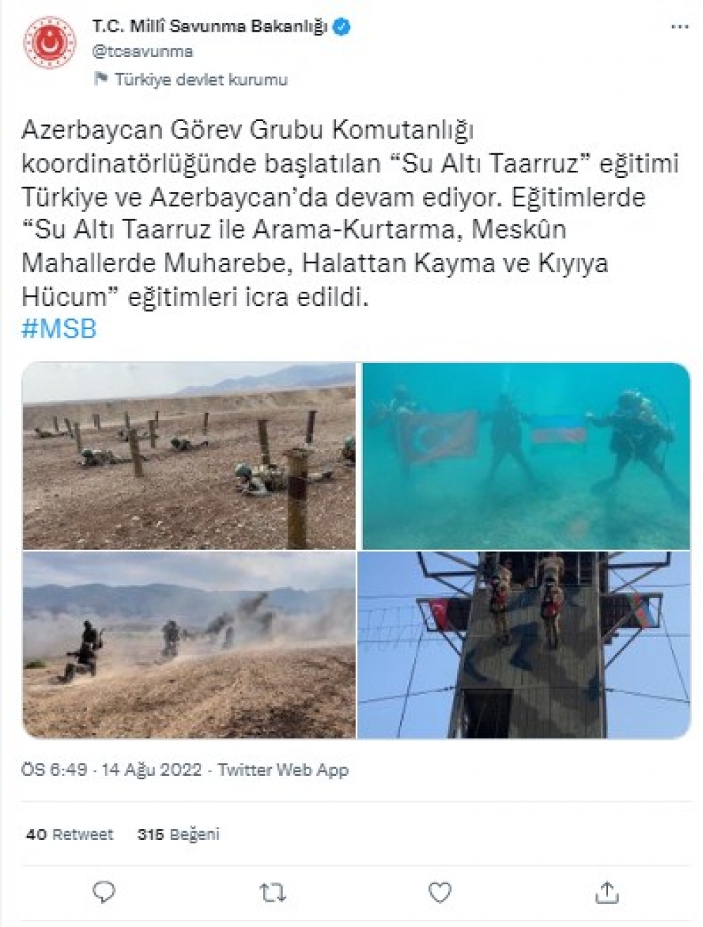 Qeyd olunub ki, Türkiyə və Azərbaycanda keçirilən təlimlər çərçivəsində “Sualtı Hücum və axtarış-xilasetmə”, “Yaşayış sahələrində döyüş” və “İplə sürüşmə və Sahilə hücum” təlimləri keçirilib.