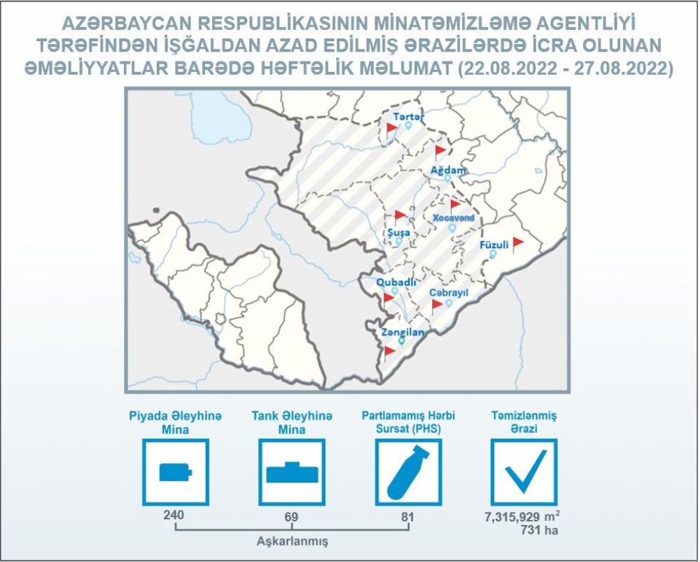 ANAMA-dan "İki sahil"ə verilən məlumata görə, avqustun 22-dən 27-dək Tərtər, Ağdam, Xocavənd, Füzuli, Şuşa, Qubadlı, Cəbrayıl və Zəngilanda aparılan minatəmizləmə əməliyyatları zamanı piyada əleyhinə 240, tank əleyhinə 69 mina və 81 partlamamış hərbi sursat aşkarlanaraq zərərsizləşdirilib.
