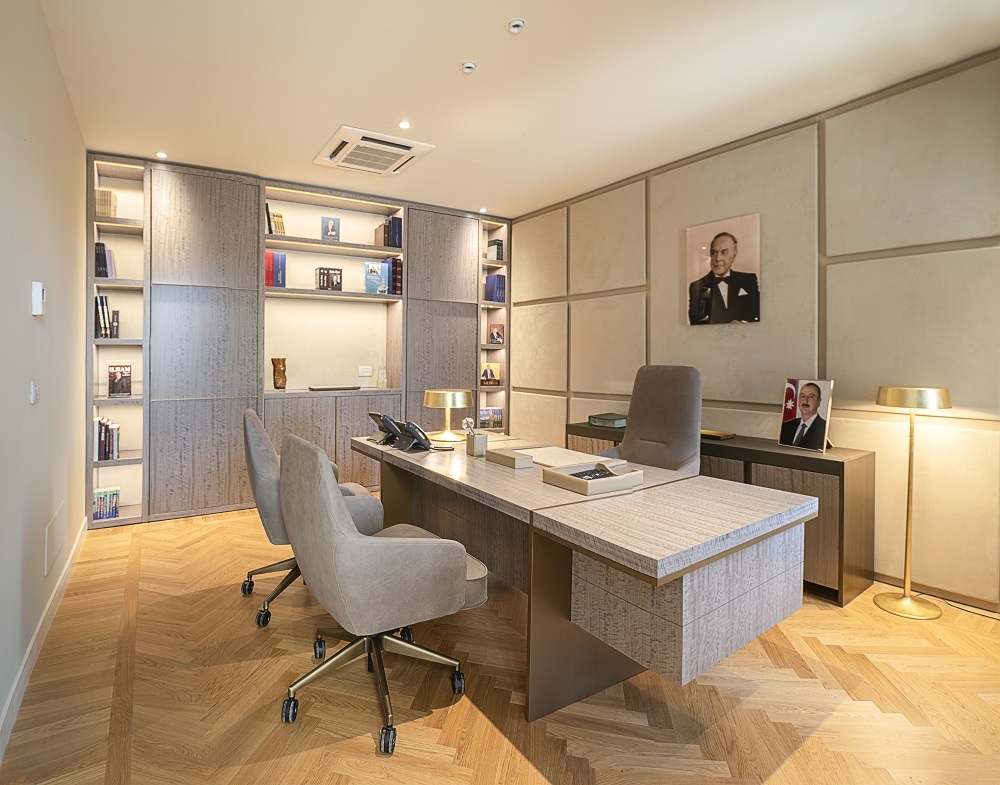 Binada diplomatik heyətimiz üçün iş otaqları, konsulluq şöbəsi, 1 və 2-ci mərtəbələrdə isə Azərbaycan mədəniyyətinin təqdimatları üçün otaq və zallar var. Eyni zamanda binada Heydər Əliyev Fondunun dəstəyi ilə mədəniyyət otaqları yaradılıb. Azərbaycan mədəniyyətinin incilərinin təqdim olunduğu otaqlarda milli xalçalar, geyimlər, musiqi və xalq sənətkarlığının müxtəlif nümunələri nümayiş olunur. Binada, həmçinin kitabxana yaradılıb və müvəqqəti sərgilərin təşkili üçün zal var. Zalda müxtəlif görüşlər, konfranslar, dərslər də təşkil oluna bilər. Hazırda zalda Heydər Əliyev Fondunun dəstəyi ilə "Mənim Azərbaycanım" adlı rəsm sərgisi nümayiş olunur. Sərgidə Azərbaycanın təsviri sənətinin müxtəlif nümunələri təqdim edilir.