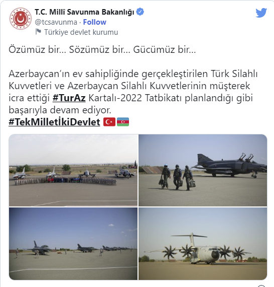 “Özümüz bir, sözümüz bir, gücümüz bir. Azərbaycanın ev sahibliyi ilə gerçəkləşdirilən Türkiyə Silahlı Qüvvələri və Azərbaycan Silahlı Qüvvələrinin birgə icra etdiyi “TurAz Qartalı-2022” təlimi planlaşdırıldığı kimi uğurla davam edir”.