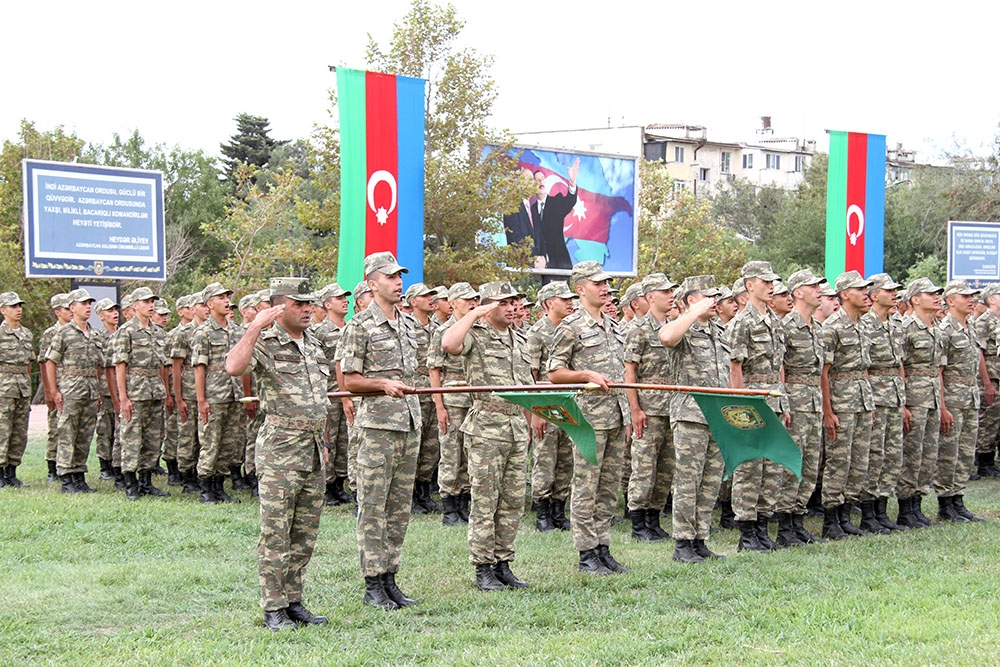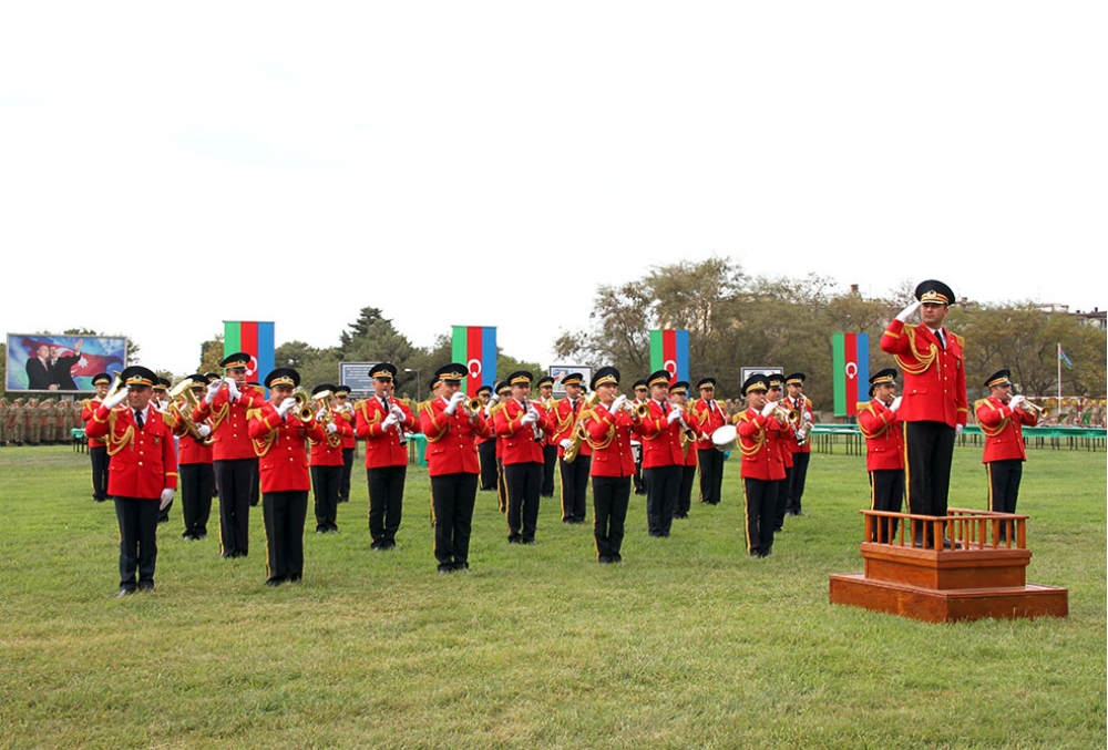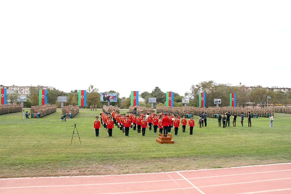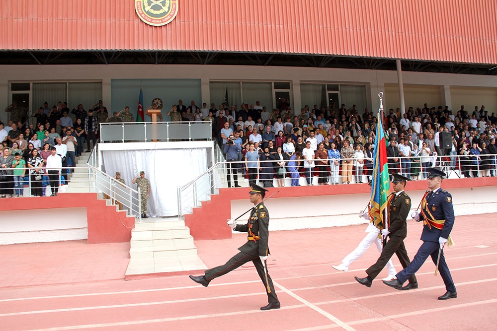 Əvvəlcə hərbi orkestrin müşayiəti ilə hərbi institutun döyüş bayrağı təntənəli surətdə sıra meydanına gətirilib.