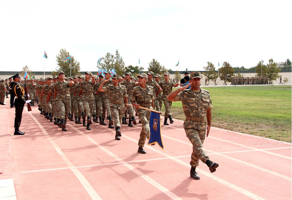 Kursantlar təntənəli şəkildə Vətənə sədaqət andı içdikdən sonra hərbi marşın sədaları altında tribuna önündən keçiblər.