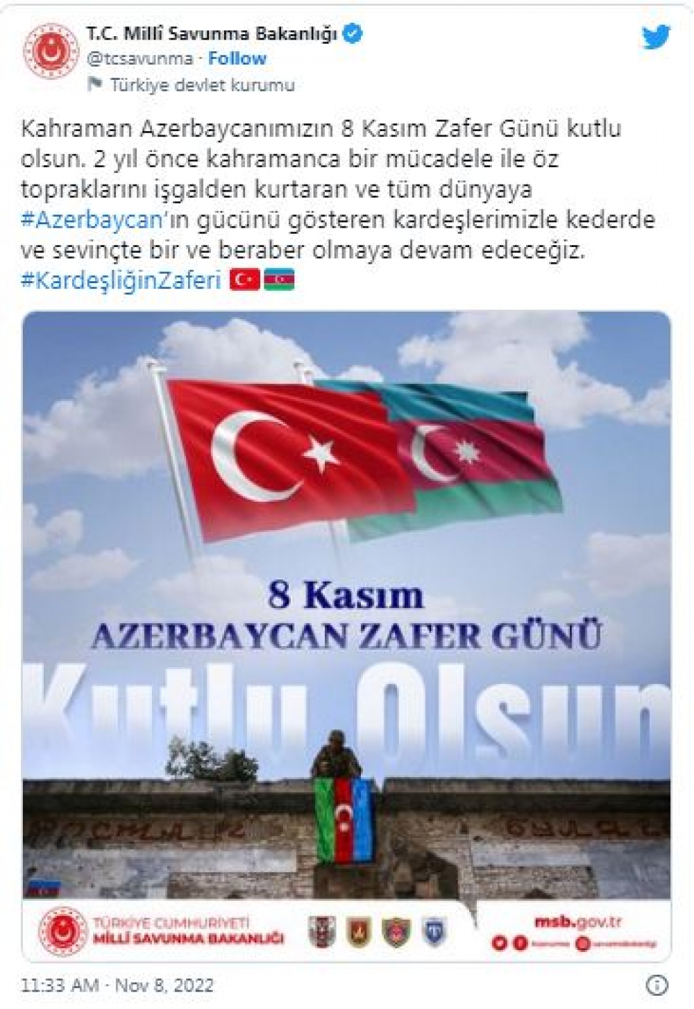 Türkiyə Müdafiə Nazirliyi 8 Noyabr - Zəfər Günü münasibətilə Azərbaycan xalqını təbrik edib.