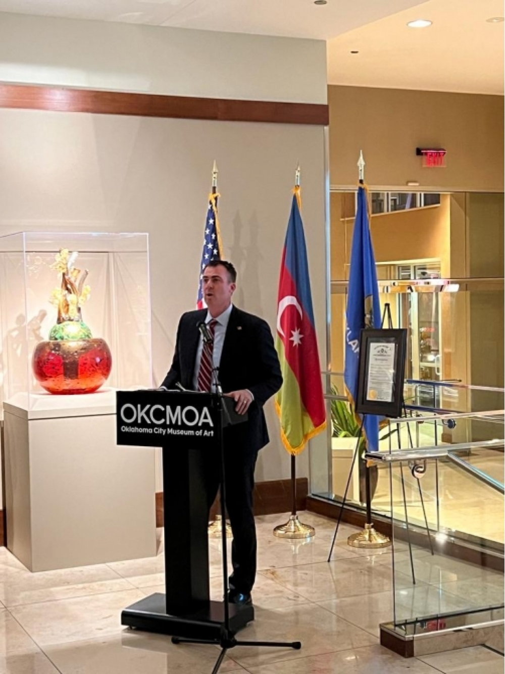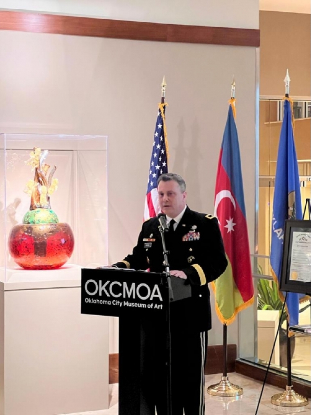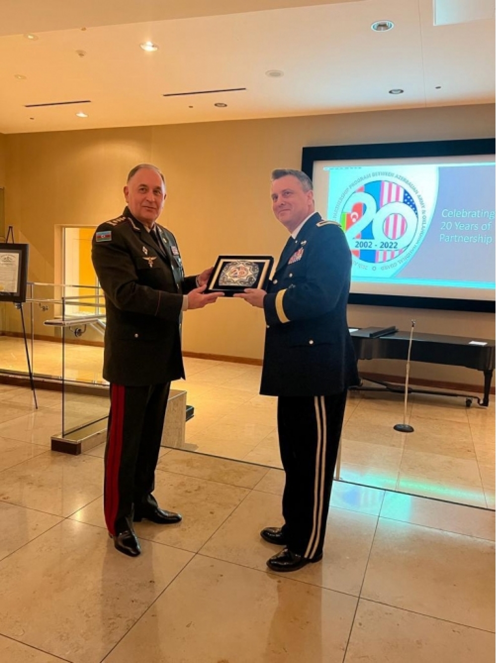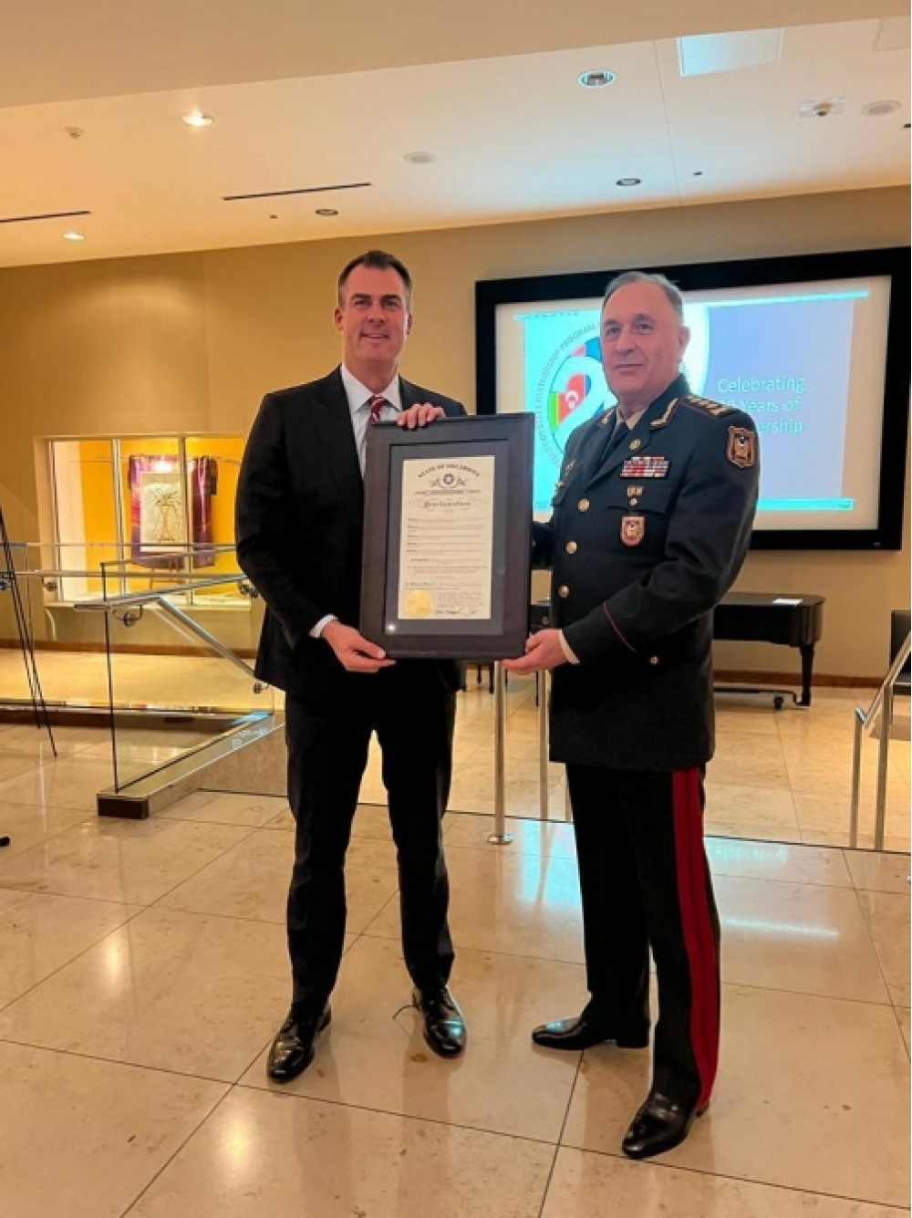 Çıxışlardan sonra general-polkovnik K.Vəliyev Ştatla Tərəfdaşlıq Proqramının 20 illiyi münasibətilə hazırlanmış lövhəni Oklahoma Qubernatoruna və Oklahoma Milli Qvardiyasının komandanına təqdim edib. Öz növbəsində, Qubernator 19 sentyabr tarixinin Azərbaycan Ordusu və Oklahoma Milli Qvardiyası arasında Ştatla Tərəfdaşlıq Proqramının imzalanma günü elan edilməsinə dair lövhəni general-polkovnik K.Vəliyevə təqdim edib.