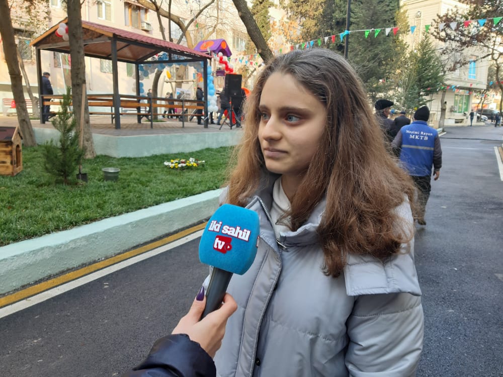 Aliyə Kərimova 11 ildir ki, bu binanın sakinidir: “Əvvəllər istirahət üçün əgər başqa yerlərə üz tuturduqsa indi rahatlıqla öz həyətimizdə vaxtımızı keçirə bilirik. Biz bundan artıq daha nə istəyə bilərdik? Həyət və binamızın göz oxşayan mənzərəsinə, səliqəsinə görə dövlət başçımıza və Nəsimi Rayon İcra Hakimiyyətinə minnətdaram. Salınan yaşıllıqlar, uşaqlar üçün yaradılan möhtəşəm şərait sadəcə möhtəşəmdir. Həyətdə bir çox yerlərdə təhlükəsizlik kameraları yerləşdirilib və onlar bütün gün ərzində işləyirlər. Maşınların saxlanması üçün ayrıca ərazi salınıb, həyətdə uşaqların əylənməsi məqsədilə rəngarəng oyuncaqlar, yelləncəklər qurulub. Ahılların dincəlmələri üçün yeni və təmiz oturacaqlar yerləşdirilib. Yaşıllıq, təmizlik insanların ruhunu oxşayır. Əvvəlki baxımsız həyətdən indi əsər-əlamət qalmayıb.”