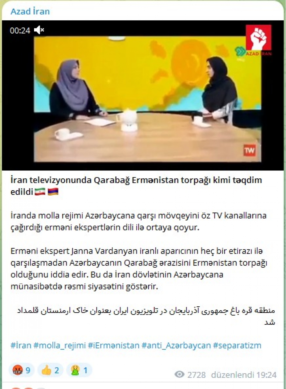 Erməni ekspert Janna Vardanyan iranlı aparıcının heç bir etirazı ilə qarşılaşmadan Azərbaycanın Qarabağ ərazisini Ermənistan torpağı olduğunu iddia edir. Bu da İran dövlətinin Azərbaycana münasibətdə rəsmi siyasətini göstərir.