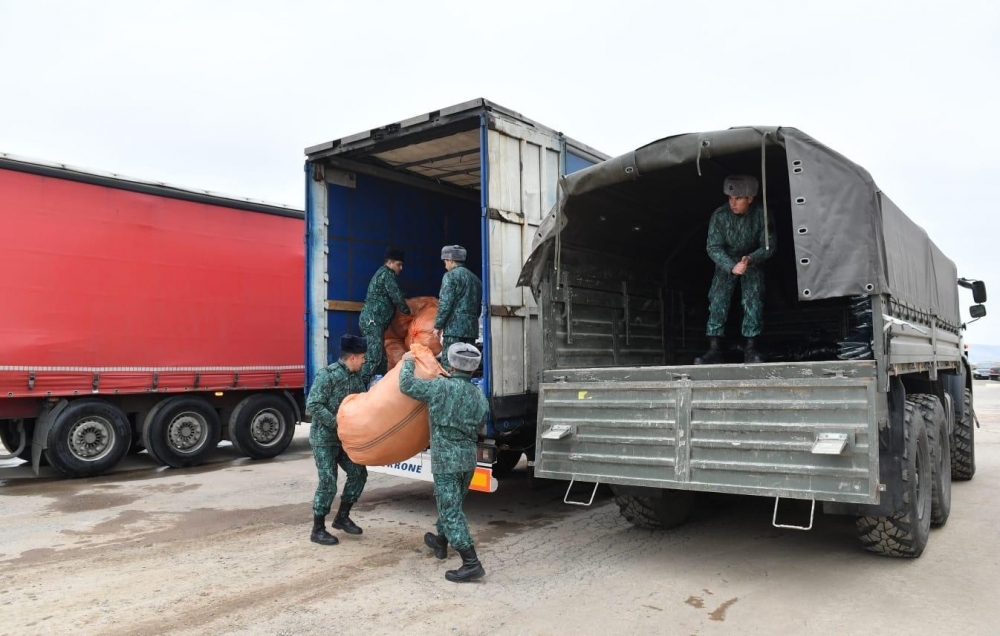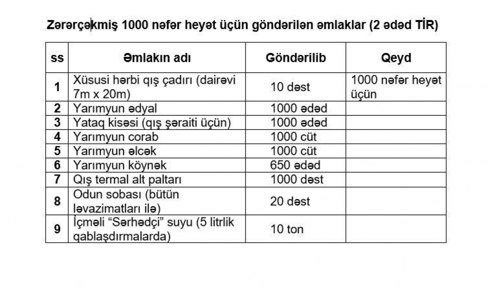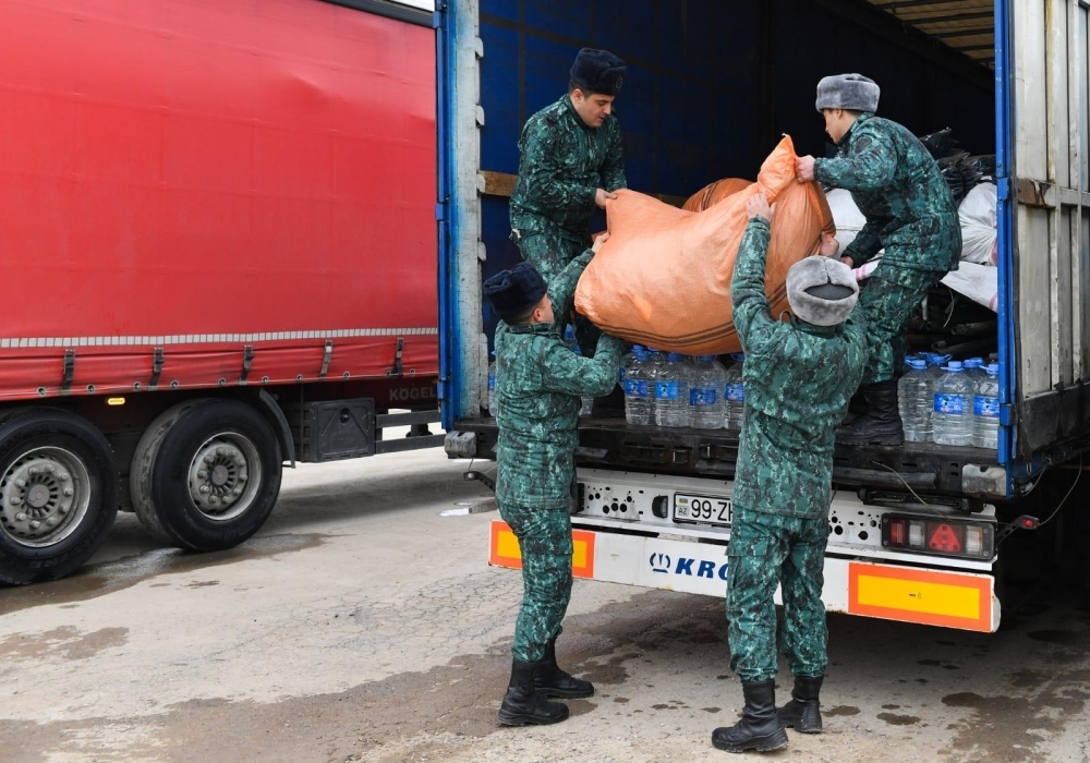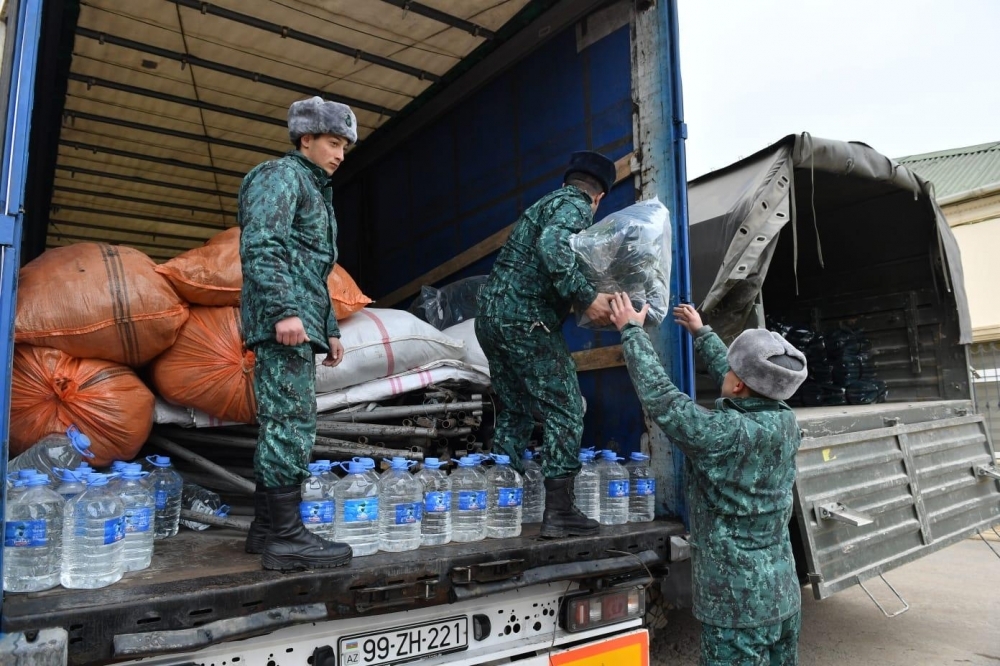 DSX-yə məxsus 2 TIR vasitəsilə zəlzələdən zərərçəkmişlər üçün yola salınan humanitar yardıma xüsusi hərbi qış çadırı, yarımyun ədyal, yataq kisəsi (qış şəraiti üçün), yarımyun corab, yarımyun əlcək, yarımyun köynək, qış termal alt paltarı, odun sobası (bütün ləvazimatları ilə), içməli “Sərhədçi” suyu (5 litrlik qablaşdırmalarda) daxildir.