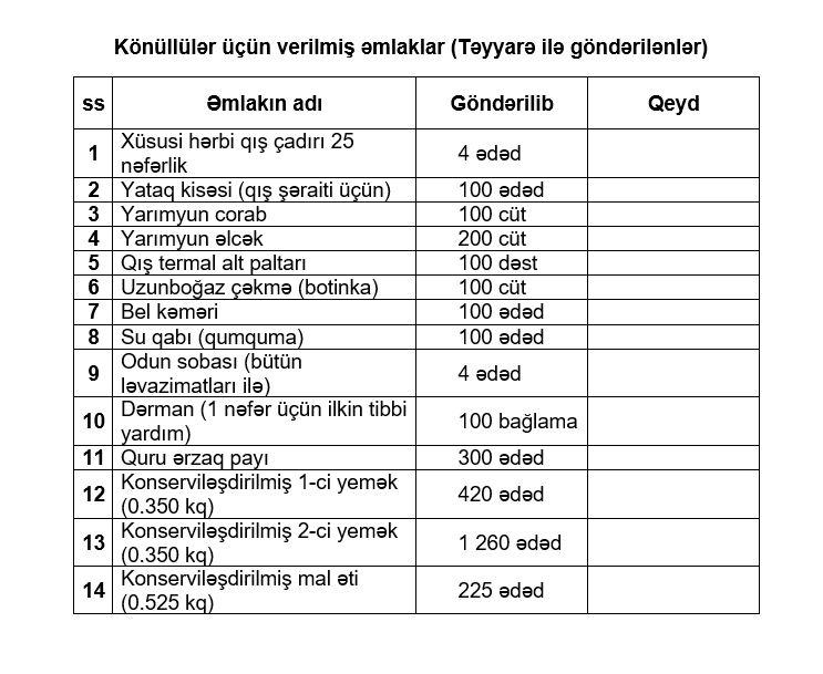 Eyni zamanda zəlzələ zonasında fəaliyyət göstərən könüllülər üçün təyyarə ilə göndərilən yardıma xüsusi hərbi qış çadırı 25 nəfərlik, yataq kisəsi (qış şəraiti üçün), yarımyun corab, yarımyun əlcək, qış termal alt paltarı, uzunboğaz çəkmə (botinka), bel kəməri, su qabı (qumquma), odun sobası (bütün ləvazimatları ilə), dərman (1 nəfər üçün ilkin tibbi yardım), quru ərzaq payı, konserviləşdirilmiş 1-ci yemək (0.350 kq), konserviləşdirilmiş 2-ci yemək (0.350 kq), konserviləşdirilmiş mal əti (0.525 kq) daxildir.