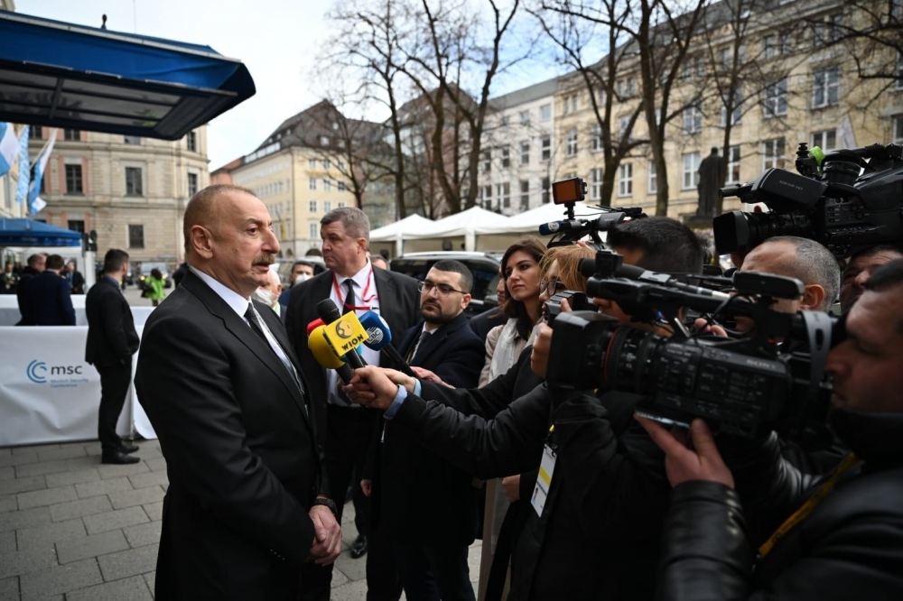 Azərbaycan Respublikasının Prezidenti İlham Əliyev fevralın 18-də Münxendə Amerika Birləşmiş Ştatlarının Dövlət katibi Antoni Blinken və Ermənistan Respublikasının baş naziri Nikol Paşinyan ilə birgə görüşdən sonra televiziya kanallarına müsahibə verib.