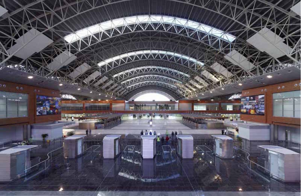Hava limanının üçlü sürtünmə sarkaçlı rulmanı Zəlzələdən Mühafizə Sistemləri (ZMS) tərəfindən istehsal edilib. Onlar ciddi zəlzələ hadisələri zamanı strukturun izolyasiyasını uzatmaq üçün əsas sarkaç prinsipindən istifadə edirlər.