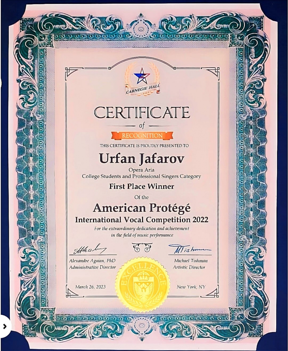 Gənclər və İdman Nazirliyinin dəstəyi ilə ABŞ-ın Nyu-York şəhərində keçirilən "American International Vocal Competition of Opera Singers 2023" beynəlxalq opera ifaçılarının vokal müsabiqəsində iştirak edən gənc opera ifaçısı Urfan Cəfərov 67 ölkə arasında qızıl medal qazanaraq 1-ci yer tutub.
