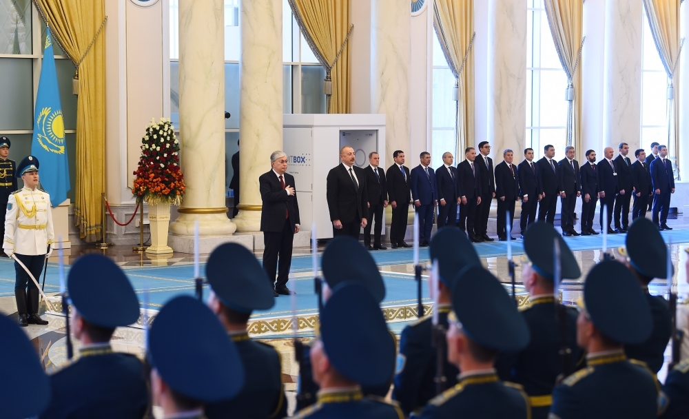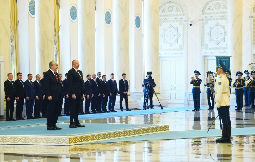 Fəxri qarovul dəstəsinin rəisi Azərbaycan Prezidentinə raport verdi. Azərbaycanın və Qazaxıstanın Dövlət himnləri səsləndi.