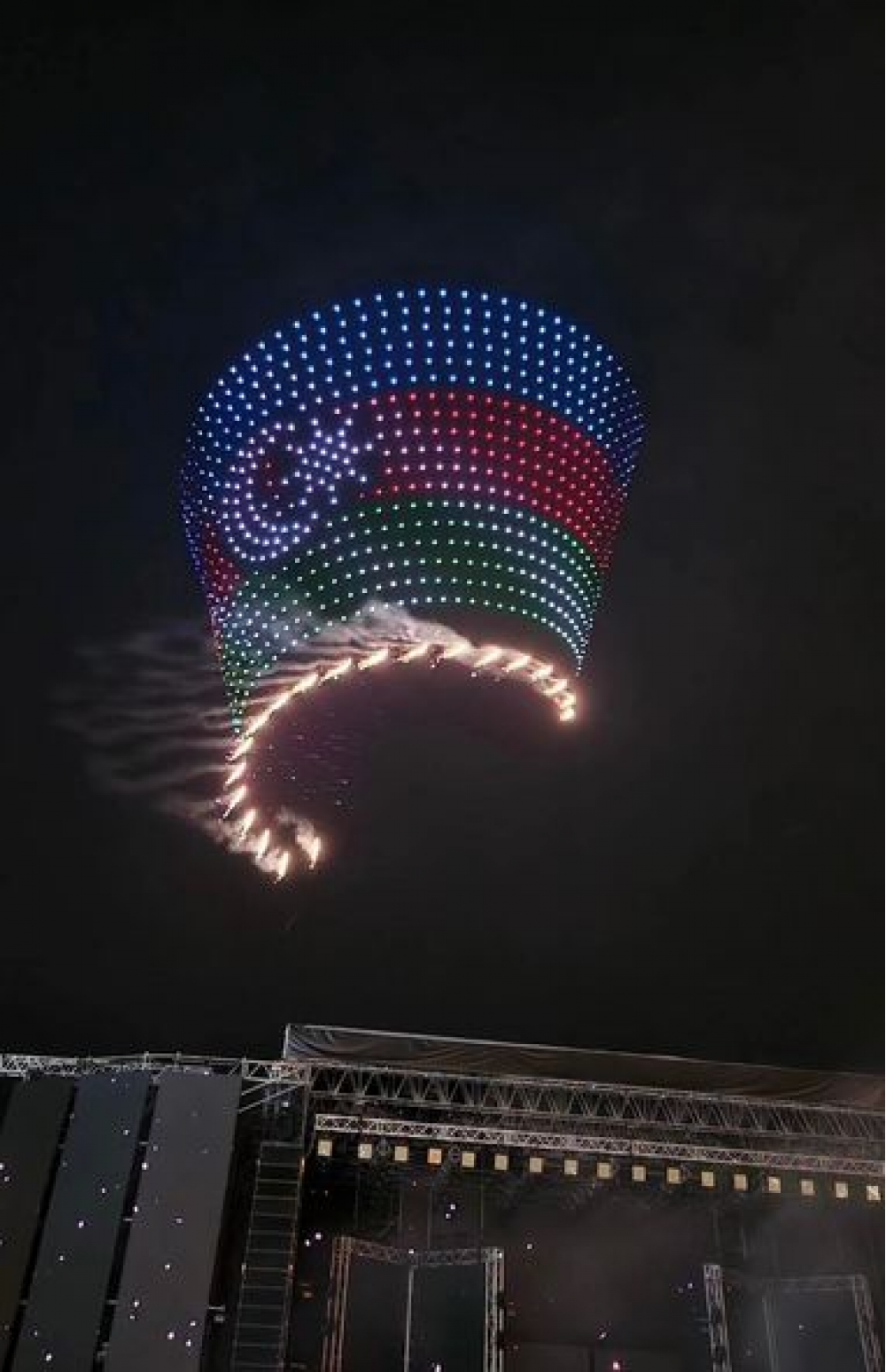 “İki sahil” xəbər verir ki, Şouda dronların iştirakı ilə Heydər Əliyev Mərkəzinin, Qız qalasının, Azərbaycan xəritəsinin, Xarı Bülbülün görüntüləri əks olunub.