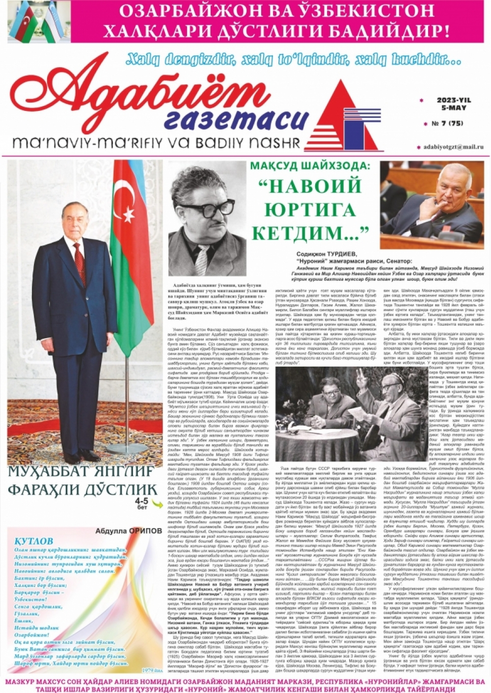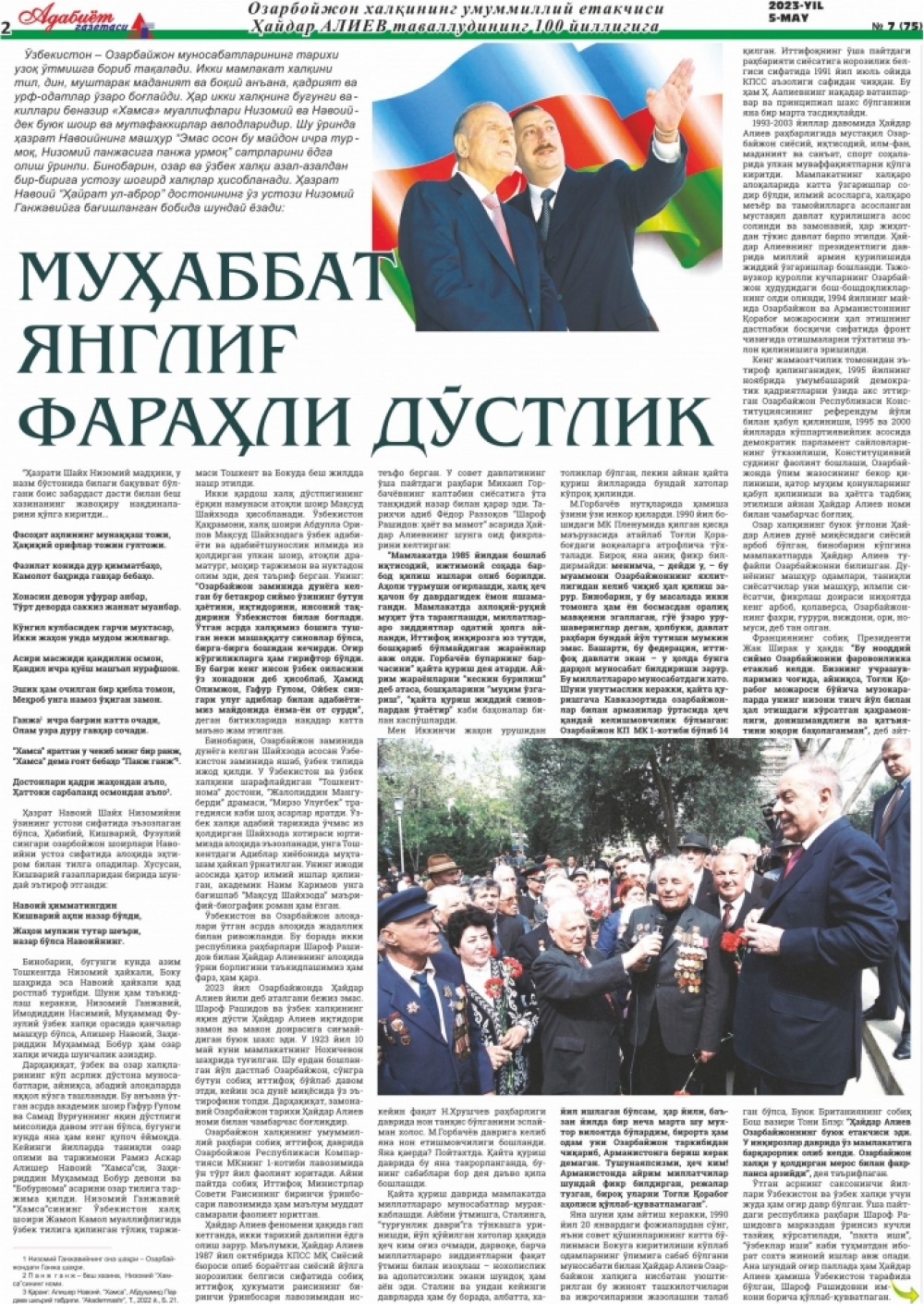 Qəzetin 6-cı səhifəsində “Şərəf Rəşidovun dostu, Azərbaycam xalqının Ulu Öndəri” adlı məqalədə Ümumilli Lider Heydər Əliyevə və Azərbaycana həsr edilmiş ədəbi əsərlərdən söz açılıb. Müəllifi Özbəkistan Yazıçılar Birliyinin üzvü, tanınmış jurnalist Nəsir Tairov olan və Özbəkistan Respublikasının Prezidenti Şavkat Mirziyoyevin Heydər Əliyevlə bağlı fikirləri ilə başlayan məqalədə özbəkistanlı müəlliflər tərəfindən Heydər Əliyevə həsr edilmiş şeirlər, poemalar, əsərlərdən söz açılaraq Özbəkistanın xalq şairi Normurad Narzullayevin Heydər Əliyev və Şərəf Rəşidova həsr olunmuş şeirindən bir parça verilib. Müəllif daha sonra Belarus Yazıçılar İttifaqının üzvü, özbək əsilli publisist, yazıçı, şair, İsmət Koçiyev tərəfindən Azərbaycan xalqının böyük övladı Heydər Əliyevə həsr olunmuş “Триумф Гейдара Алиева” (Heydər Əliyev qələbəsi) adlı rus dilində qələmə alınmış böyük poemadan da geniş söz açır. Qeyd edək ki, sözügedən poema Azəərbaycan xalqının Ümummilli Lideri Heydər Əliyevin 100 illik yubileyinə həsr olunub və nəşrin Özbəkistanda geniş təqdimatı keçirilib. Məqalədə eyni zamanda Özbəkistanın xalq şairi Abdulla Aripovun məşhur “Azərbaycan” şeiri də öz əksini tapıb. Bu məşhur şeiri Abdulla Aripov ilk dəfə 1979-cu ildə Azərbaycana səfər etdiyi vaxt Heydər Əliyevlə görüş zamanı oxuyub.