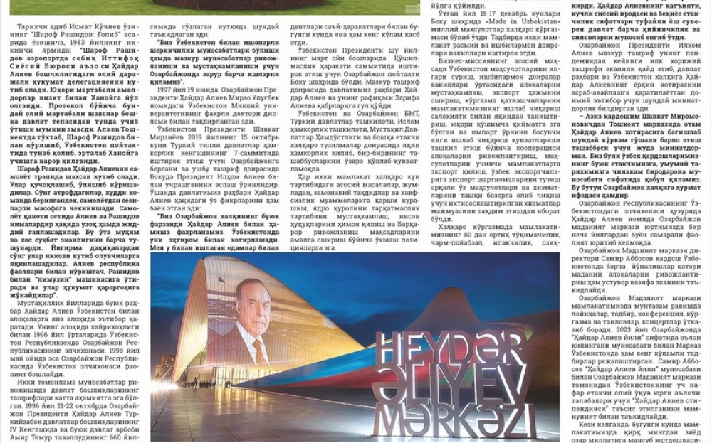 Qəzetin 7-ci səhifəsində isə Özbəkistanda fəaliyyət göstərən Respublika Azərbaycan Milli Mədəniyyət Mərkəzinin İdarə Heyətinin sədri Mobil Məmmədovun müəllifi olduğu “İki qardaş ölkə – Azərbaycan və Özbəkistan” sərlövhəli məqalə dərc edilib. Məqalədə qardaş ölkədə yaşayan azərbaycanlıların dahi şəxsiyyət Heydər Əliyevlə fəxr etdikləri bildirilib. Ölkələrimiz arasında münasibətlərin uzun, möhkəm, sarsılmaz köklərə malik olduğu, Azərbaycan xalqının dahi oğlu Heydər Əliyevin Özbəkistanda hər zaman böyük ehtiramla xatırlandığı vurğulanıb. Məqalədə müstəqil Azərbaycanın dünya dövlətləri arasında inamla irəliləməsi, qədim köklərini, tarixi keçmişini, zəngin mədəniyyətini qoruyub saxlayaraq türk dövlətləri, o cümlədən Özbəkistan tarixi dostluğu və əməkdaşlığı uğurla davam etdirməsi də qeyd edilərək, xalqlarımız, dövlətlərimiz arasında əlaqələrin yüksək səviyyəyə çatmasında Azərbaycan Prezidenti İlham Əliyevin və Özbəkistan Prezidenti Şavkat Mirziyoyevin müstəsna xidmətləri yüksək qiymətləndirilir.