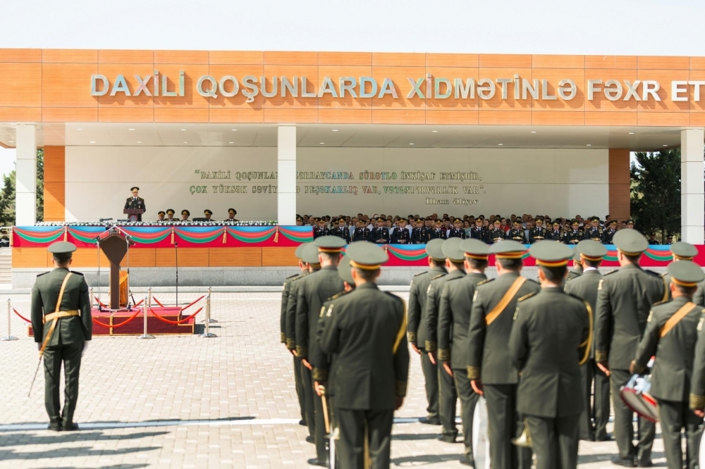 Gənc zabitlər önündə çıxış edən nazir V.Eyvazov məmnunluqla bildirib ki, Azərbaycanın Prezidenti, Silahlı Qüvvələrin Ali Baş Komandanı cənab İlham Əliyev Qoşunların döyüş hazırlığının yüksəldilməsini daim nəzarətdə saxlayıb, müasir silah və texnika ilə təminatı, şəxsi heyətinin sosial müdafiəsinin gücləndirilməsi sahəsində bir çox vacib qərarlar qəbul edib. Məhz bu ali diqqətin nəticəsidir ki, Daxili Qoşunlar qarşıya qoyulan xidməti-döyüş tapşırıqlarını yüksək səviyyədə yerinə yetirməyə qadir silahlı birləşməyə çevrilib.