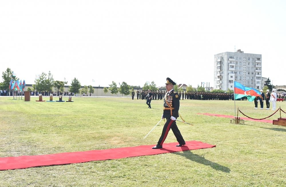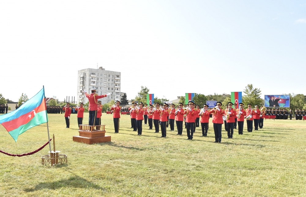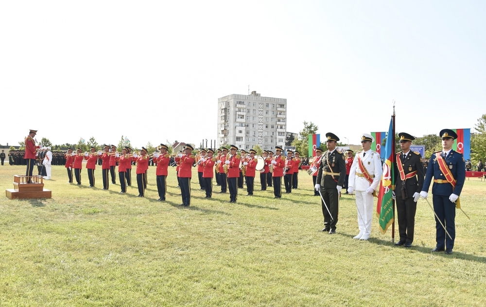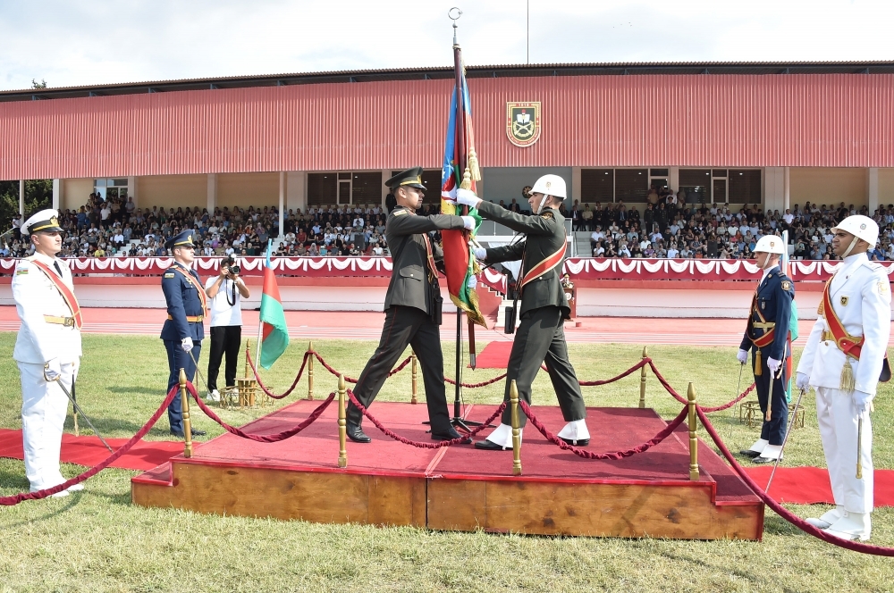 Mərasimdə hərbi orkestrin müşayiəti ilə Azərbaycan Respublikasının Dövlət Himni səsləndirilib, hərbi institutun Döyüş bayrağı təntənəli surətdə sıra meydanına gətirilib.