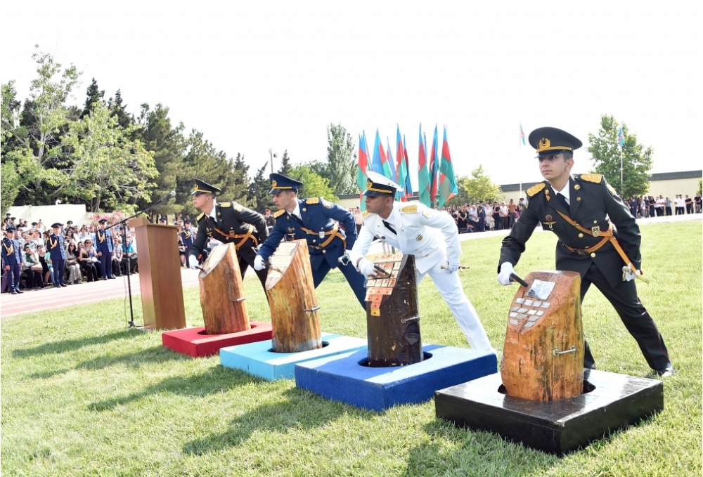 Sonra hərbi təhsil müəssisəsini fərqlənmə ilə bitirənlərə diplom və hədiyyələr təqdim olunub. Heydər Əliyev adına Hərbi İnstitutun Döyüş bayrağının təhvili və qəbulu mərasimi keçirildikdən sonra yaş kötüyünə simvollar vurulub. Hərbi orkestrin və kursantların ifasında hərbi institutun marşı ifa edilib, şəxsi heyətin tribuna önündən təntənəli keçidi olub.