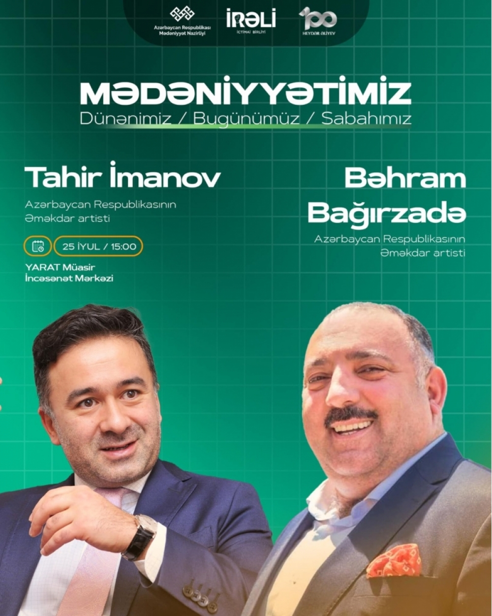 Azərbaycan Respublikasının Mədəniyyət Nazirliyinin dəstəyi, “İRƏLİ” İctimai Birliyinin təşkilatçılığı ilə Ümummilli Lider Heydər Əliyevin anadan olmasının 100-cü ildönümünə həsr olunmuş tədbirlər proqramı çərçivəsində “MədəniyyətimİZ” layihəsinin növbəti görüşü Azərbaycan Respublikasının Əməkdar artistləri Tahir İmanov və Bəhram Bağırzadə ilə olacaq.