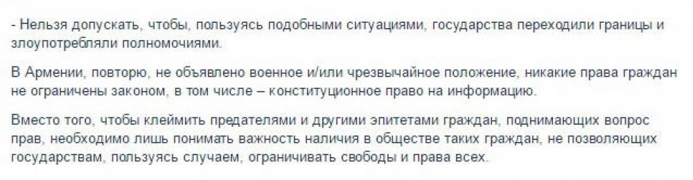 "Fövqəladə vəziyyətlərdə Ermənistanın kütləvi informasiya vasitələri 1-ci Kanalın klonlarına, bütün siyasi partiyalar isə iqtidardakı Ermənistan Respublika Partiyasının eybəcər "əkiz"lərinə dönürlər. Artıq nifrət edirəm bu ölkəyə! Tərk edəcəyəm bu dövləti!"