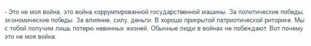 "Bu, mənim savaşım deyil! Bu, rüşvətxor, korrupsiyaya boğulmuş hakimiyyətin, Serj Sarkisyanın dövlət maşınının savaşıdır. Sarkisyanın dəstəsi siyasi qələbələr, iqtisadiyyatdakı bərbad vəziyyəti ört-basdır etmək üçün köpüklü vətənpərvərlik dalğası yaratmaq üçün savaşır. Sənlə mən isə sadəcə, günahsız insanların ölümünü alırıq. Adi insanlar bu savaşda qalib gəlmir. Bax, buna görə də baş verənlər mənim savaşım deyil".