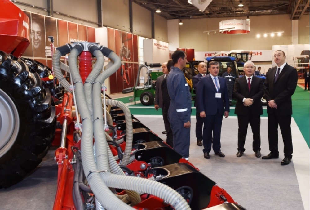 Sonra Azərbaycan Prezidenti İlham Əliyev “Gəncə Avtomobil Zavodu” İstehsalat Birliyinin sərgidə nümayiş etdirilən traktorlarına baxdı. Burada müəssisənin istehsalı olan 10 müxtəlif model traktor, otbiçən və kotanlar nümayiş etdirilir. Traktor modellərindən bəziləri ilk dəfə olaraq müəssisə tərəfindən sərgidə təqdim edilir. Onların arasında pambıq əkini və kəskin isti hava şəraitində məhsul yığımı üçün nəzərdə tutulan kondisionerli traktorlar da var. Sərgidə nümayiş olunan traktorların 3-ü xüsusi təyinatlıdır. Onlardan tikinti, kommunal və yol təsərrüfatı sahələrində istifadə edilə bilər.