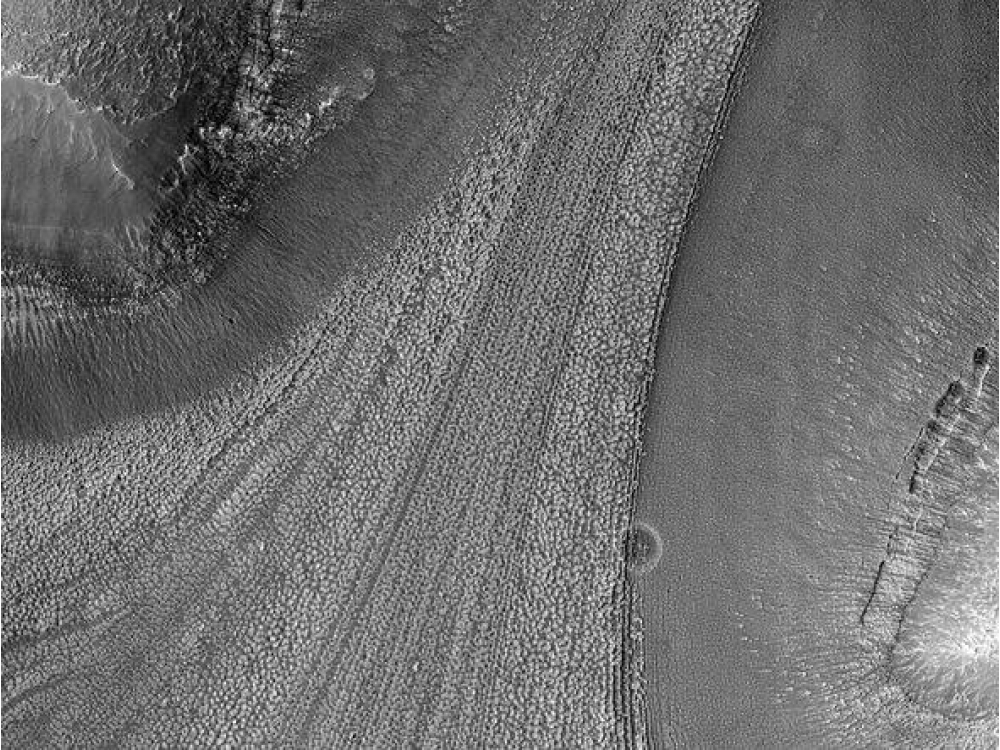 “İki sahil” xəbər verir ki, şəkildə Qırmızı planetin səthində qabırğalı xətlər şəklində füsunkar naxışlar göstərilir. Bu cizgilər tədricən landşaft boyunca hərəkət edən buzların izidir.