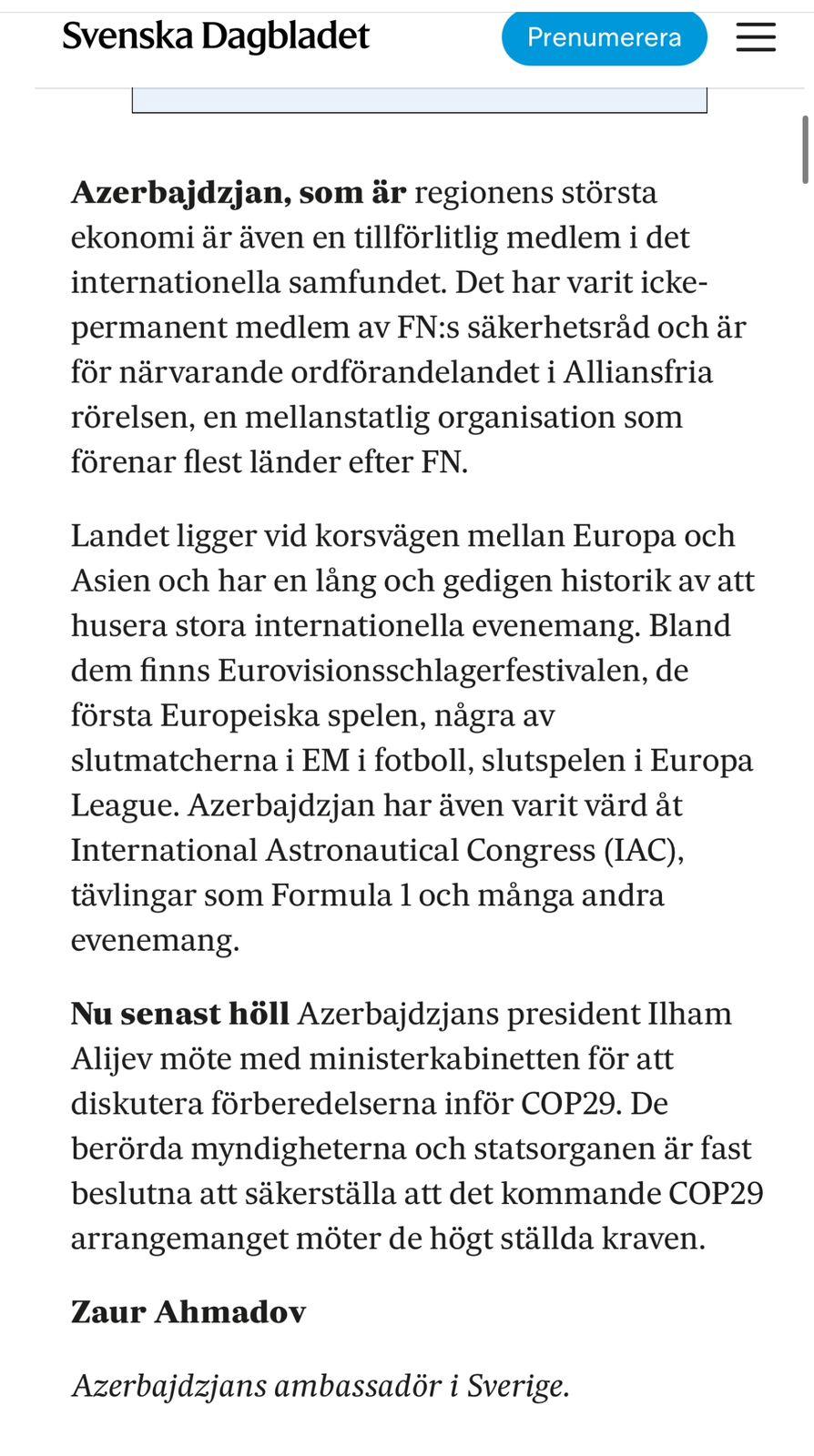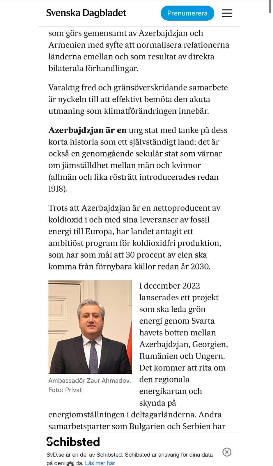 “İki sahil” xəbər verir ki, bu fikirlər Azərbaycanın İsveçdəki səfiri Zaur Əhmədovun bu ölkənin “Svenska Dagbladet” qəzetində dərc olunan məqaləsində yer alıb.