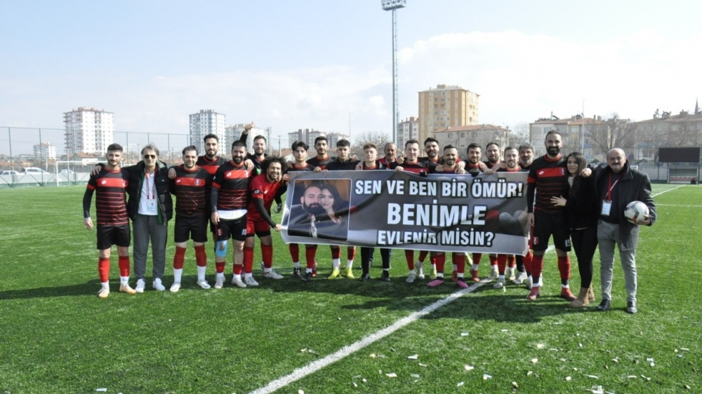 Futbol üzrə həvəskarlar liqasında çempion olan "Özvatan Belediyespor"un futbolçusu Mustafa Aydın qazandıqları matçdan sonra azarkeşlərin və komanda yoldaşlarının alqışları ilə sevgilisinə evlilik təklifi edib. Futbolçu aldığı “bəli” cavabına ikiqat sevinib.