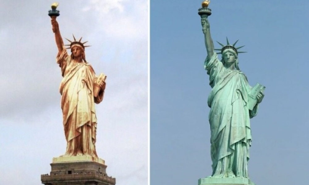 Azadlıq Heykəli həmişə cəlbedici yaşıl rəngdə olmayıb. O, ucaldılan zaman (1886), cilalanmamış misə xas olan tünd qəhvəyi rəngə malik idi. Heykəlin qabığı bu materialdan hazırlanıb, ona görə də təəccüblü deyil ki, cəmi 30 il ərzində nəhəng heykəl əlamətdar yaşıl görüntünü əldə edib.