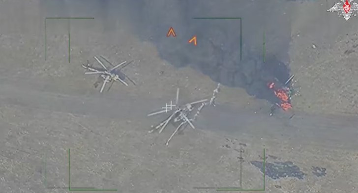 Kadrlardan görünür ki, pilotsuz uçuş aparatının köməyi ilə kəşfiyyat zamanı Ukrayna ordusunun iki helikopteri aşkarlanıb. Bildirilir ki, helikopterlər yanacaq doldurmaq və silahlar yükləmək üçün gizli sahəyə eniş edib.