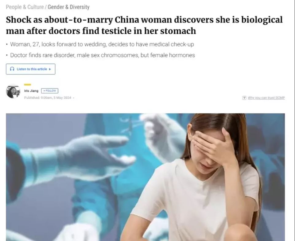 Çin mətbuatının manşetlərini bəzəyən başqa bir xəbərdə isə evlənməyə hazırlaşan həmin qadının bioloji olaraq kişi olduğu yazılıb. Medianın xəbərinə görə toyun ləğv edilməsinə nikah üçün tibbi rəy zamanı ortaya çıxan həqiqət səbəb olub.