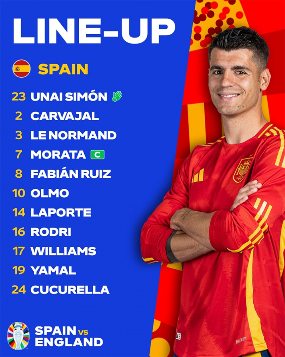 İspaniya: Unai Simon; Dani Karvahal, Robin Le Normand, Emerik Laport, Mark Kukurella, Rodri, Fabian, Dani Olmo, Lamine Yamal, Nico Uilliyams, Morata