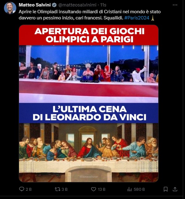 Mərasimdə Leonardo da Vinçinin məşhur “Son Şam yeməyi” səhnəsini dünyadakı milyonlarla xristianın təhqiri kimi xarakterizə edən nazir yazıb: “Dünyada milyardlarla xristianı təhqir edərək Olimpiadanı açmaq həqiqətən pis başlanğıc idi, əziz fransızlar”.