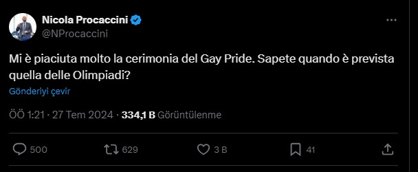 O, “X” sosial şəbəkəsindəki paylaşımında kinayə ilə yazıb: “Gey parad mərasimini çox bəyəndim. Olimpiadanın nə vaxt keçiriləcəyini bilmirsiniz?”.