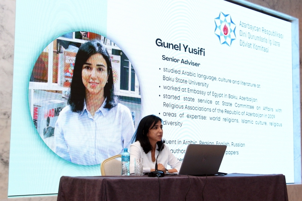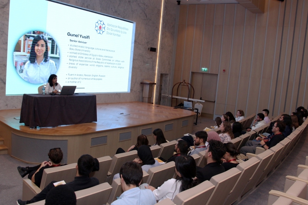 “Mədəniyyət və inancın kəsişməsi: Dini müxtəlifliyin Azərbaycan nümunəsi” mövzusunu əhatə edən mühazirədə Dini Qurumlarla İş üzrə Dövlət Komitəsinin baş məsləhətçisi Günel Yusifi qeyd edib ki, Azərbaycan dini müxtəliflik baxımından çox zəngindir. Amma xoşbəxtlikdən müxtəlif dinlərin və dini-fəlsəfi cərəyanların yayıldığı ölkəmizdə bütün tarixi dövrlərdə etnik və dini icmalar arasında möhkəm dözümlülük əlaqələri formalaşıb, milli, irqi və dini zəmində heç bir ayrı-seçkilik faktı qeydə alınmayıb. Müxtəlif tarixi dövrlərdə Azərbaycan ərazisində məskunlaşan dini-etnik qruplar yerli əhali ilə qaynayıb-qarışıb, qohumluq əlaqələri qurublar və sözün əsl mənasında birgəyaşayışın harmonik vəhdətini nümayiş etdirirlər. Fərqli dini konfessiyaların nümayəndələri hər zaman həmrəy olublar. Vətənimizdə bu cür mükəmməl tolerantlıq mühitinin yaranması dini dözümlülüyün Azərbaycan xalqının xarakterik xüsusiyyəti və milli-mənəvi sərvəti olmasına dəlalət edir. Məruzəçi bildirib ki, Azərbaycan dünyada məscid, kilsə və sinaqoqun bir arada olduğu, eləcə də müxtəlif dinlərin mənsublarının heç bir ayrı-seçkilik halı ilə qarşılaşmadıqları nadir ölkələrdən biri, bəlkə də, birincisidir.