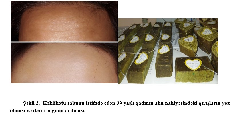 Qeyd edək ki, kəklikotu sabunu bir neçə dəri və saç problemi üzərində sınaqdan keçirilmiş və çox maraqlı faktlar müşahidə edilmişdir. Belə ki, dəridə müxtəlif səbəblərdən yaranan dəri piqmentasiyasının pozulması nəticəsində yaranan qəhvəyi rəngli ləkələr, sabundan istifadə müddətində müəyyən zaman ərzində solmuş, üz dərisi təmizlənərək rəngi açılmışdır. O cümlədən alın nahiyəsində yaranan qırışlar məhz kəklikotu sabununun istifadəsindən sonra yox olmuşdur.(Ş.2)