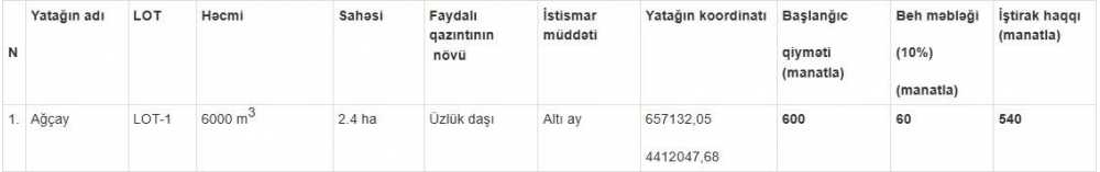 İqtisadiyyat Nazirliyi yanında Əmlak Məsələləri Dövlət Xidməti (ƏMDX) Xocalı rayonundakı "Ağçay" üzlük daşı yatağını açıq hərraca çıxarır.