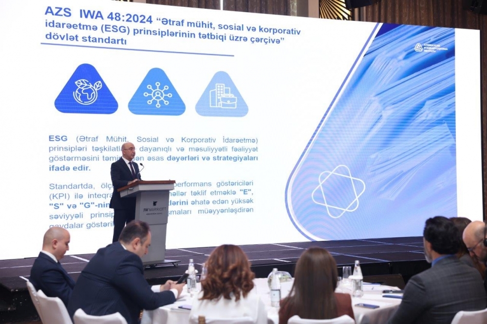 Konfransda qeyd olunub ki, ESG üzrə milli standart KOBİA-nın təşəbbüsü ilə Biznes mühiti və beynəlxalq reytinqlər üzrə Komissiya çərçivəsində Beynəlxalq Standartlaşdırma Təşkilatının tövsiyələrinə əsasən hazırlanıb və bu yaxınlarda Azərbaycan Standartlaşdırma İnstitutu tərəfindən qəbul olunub. “AZS IWA 48:2024 “Ətraf mühit, sosial və korporativ idarəetmə (ESG) prinsiplərinin tətbiqi üzrə çərçivə” dövlət standartı müvafiq sahədə qəbul olunmuş ilk təcrübələrdən hesab edilir. Yeni dövlət standartı müəssisə və təşkilatlarda ESG prinsiplərini tətbiq etməklə müasir biznes mühitində dayanıqlı inkişafı dəstəkləmək və sosial məsuliyyəti təşviq etmək üçün çərçivə təqdim edir. Standartın məqsədi müəssisə və təşkilatlara ESG strategiyalarını formalaşdırmaqda və həyata keçirməkdə kömək etməkdir. Bu standartın tətbiqi dövlət və özəl sektorda dayanıqlı inkişafı dəstəkləməklə yanaşı, müştəri məmnuniyyətini artırmaq, riskləri azaltmaq və sosial məsuliyyətin artırılması baxımından müsbət təsir göstərəcəkdir. Standartın tətbiqi könüllü xarakter daşıyır.